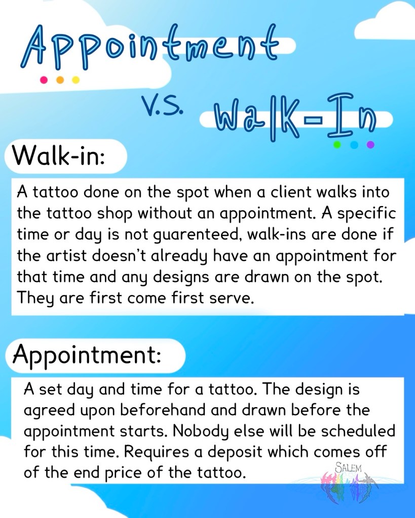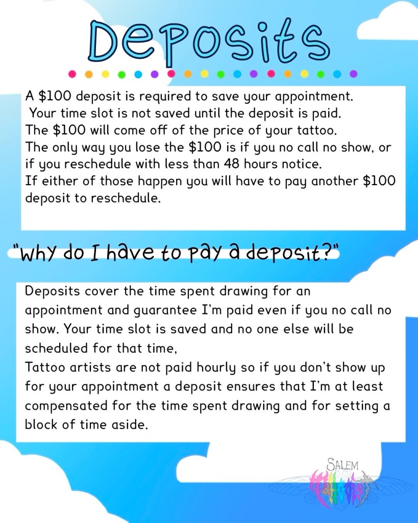 The remainder of the cost of the tattoo is due the day of your appointment after the tattoo is complete. I can accept payment through cash, tap to pay credit/debit card, Zelle, Venmo, Cashapp, Afterpay*, or Klara*. We have an ATM inside of the tattoo shop in the lobby area as well.