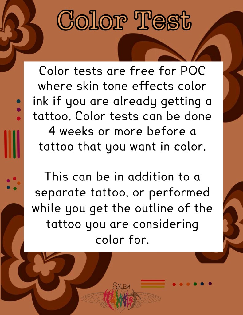 I have options for color tests available if you’re worried about how color ink or certain colors will show up on your skin tone.