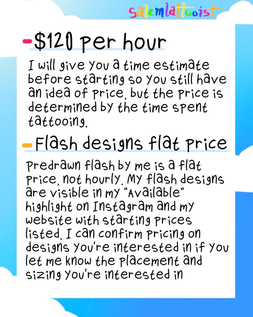 -Predrawn flash designs are a flat rate, or larger flash designs may be hourly but at $120 per hour rate. You can find my available designs in my “Available” tab with their starting prices. The price may be effected by sizing and placement, if there’s a piece you’re interested in let me know how large you want it and where and I can verify the price with you