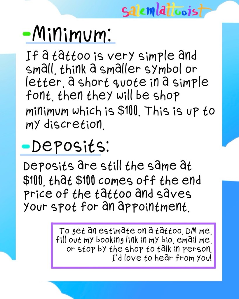 -Minimum is $100, so if there’s a tattoo that’s especially simple, takes under an hour, and in a simple location to tattoo then it may be $100 instead of the hourly $150. This is up to my discretion