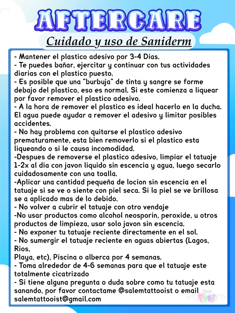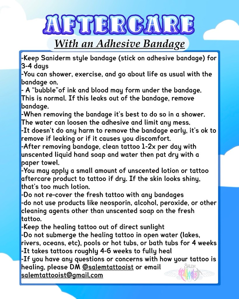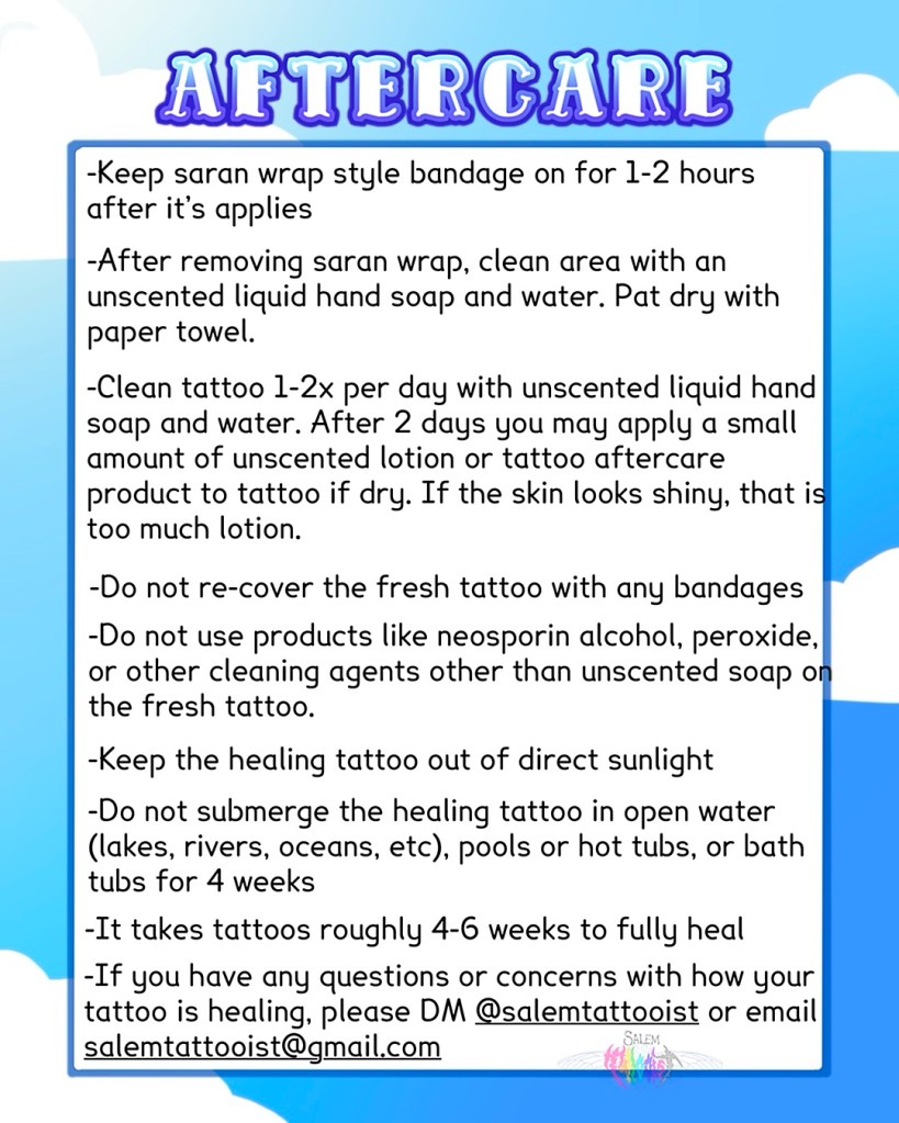 If you have any questions or concerns with how your tattoo is healing, please DM @salemtattooist or email salemtattooist@gmail.com